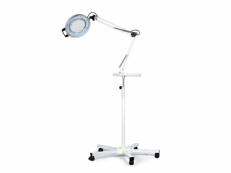 - Versátil: desenvolvida para regulagem de altura da coluna, suporte e da luminária, com braços flexíveis, podendo colocar a lupa em diversas posições